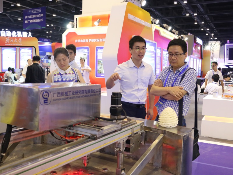 此次展會以“創新支撐發展,建設壯美廣西”為主題,機械院公司除了作為廣西先進制造的突出成就單位落戶于廣西科技支撐產業高質量發展展區的先進制造板塊(以下簡稱“先進制造”展區),同時還作為南寧市重大專項的科技成果創新單位亮相于南寧市的區域展廳。機械院公司近年來貫徹落實“中國制造2025”工作要求,加快推進“互聯網+工業”行動,促進互聯網、大數據、人工智能與制造業的深度融合,推動“廣西制造”向“廣西智造”轉變。在“先進制造”展區,我司的精品“三劍客”--套裝式內外袋物料包裝全自動生產線、高壓清洗機器人系統和3D打印項目閃耀登場,傾力展示工業機器人領域以及3D打印領域的創新成果。