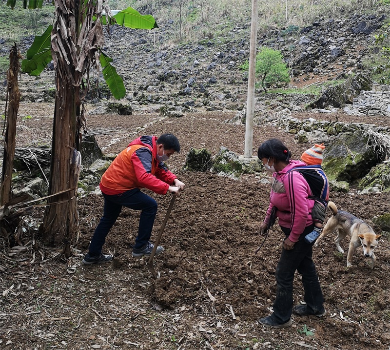 古竹村今年的旱季比往年來得要長些,一場春雨來到,覃敢再次忙碌起來,他組織工作隊入戶宣傳春耕春種知識和把握季節的重要性和緊迫性。“今年春耕農用物資準備得怎么樣了?種子、肥料購買了嗎?”了解到由于各村和鄉鎮街道實施封閉式管理,縣內所有運營車輛停運,村民外出購買春耕農用物資有困難。覃敢與村委、工作隊員們商議并多方打聽,了解到除了臨近的都安縣因疫情較嚴重暫時無法通行外,村民們可憑健康證明到大化縣城和隔壁鄉鎮街道購買農用物資。覃敢組織人員在村口設卡處把關協調,對外來運送種子、化肥、農藥等農耕物資的人員嚴格檢測,無可疑現象的為其開具健康證明,保證物資車輛順利通行,打通村民們購買農用物資的“綠色通道”。