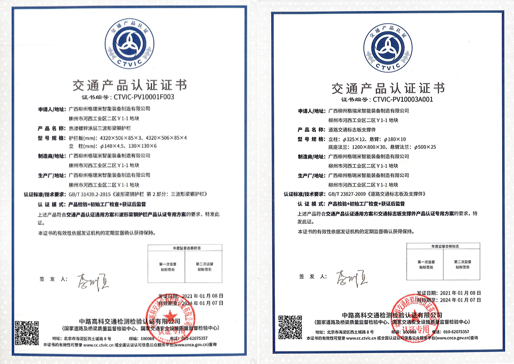 廣西柳州格瑞米智能裝備制造有限公司(簡稱柳州格瑞米公司)生產的交通產品順利通過中路高科交通檢測檢驗認證有限公司(以下簡稱CTVIC)的認證,于2021年1月20日正式取得認證證書,成為廣西省首家獲得相關交通產品認證證書的企業(yè)。