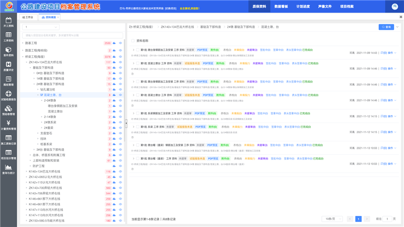 系統(tǒng)設(shè)置了管理性文件上傳、質(zhì)保資料填報與簽批、聲像文件采集等模塊,具有較強的實用性。一是關(guān)聯(lián)度高,檔案管理系統(tǒng)可與各業(yè)務(wù)系統(tǒng)(計量、征拆、試驗等系統(tǒng))實現(xiàn)集成溯源,接收數(shù)據(jù)文件,最終匯總形成案卷總目錄進(jìn)行檔案封裝。二是可實現(xiàn)資料的快速簽批,參建單位質(zhì)保資料全部實現(xiàn)電子簽章線上簽批,有效提高審批效率。三是質(zhì)保資料與現(xiàn)場施工進(jìn)度相同步,其中標(biāo)段質(zhì)保資料模塊、總監(jiān)辦抽檢資料模塊是用戶使用頻次最多的核心模塊,按照用戶反饋不斷加深優(yōu)化,通過wbs(單位分部分項)智能參數(shù)化劃分功能,項目資料填報從手動新增,變成系統(tǒng)自動批量生成,效率提升75%以上。除資料填報效率高的同時,目前系統(tǒng)采用法律認(rèn)可的電子簽章技術(shù),通過標(biāo)準(zhǔn)化數(shù)據(jù)接口,對oa、征拆、計量、質(zhì)量等多個系統(tǒng)數(shù)據(jù)實現(xiàn)一鍵歸檔,效率提升60%以上,極大提高了的工作效率,有效降低了參建單位的人力成本、時間成本、管理成本。四是系統(tǒng)已實現(xiàn)一鍵評定、自動預(yù)組卷、線上案卷封裝等功能五是實現(xiàn)公路建設(shè)項目電子檔案驗收管理系統(tǒng)的應(yīng)用六是運維團(tuán)隊能夠及時響應(yīng),由公路、檔案、信息化組成的專業(yè)項目團(tuán)隊線上全年度24小時維護(hù),線下按階段定期上門跟蹤回訪。