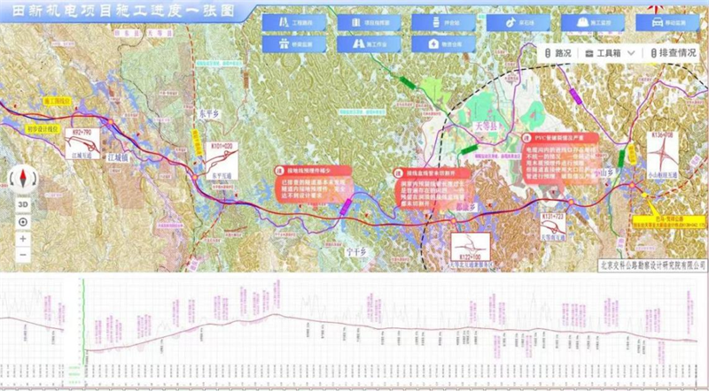 團隊還自主研發并啟用田新機電項目工程信息管理系統,該系統可實現工程信息可視化、過程管理信息化、工程管控智能化,形成“施工進度一張圖”,可以直觀地展現田新路整體施工情況,極大地優化了施工人員及車輛、安全隱患情況、質量管理、進度管理、變更情況的管理,提升了項目部對施工的管控力度,做到了危險源精準識別管控,保障了項目施工的安全平穩運行,同時為人力資源調配、設備物資采購及調撥提供了極大參考價值。