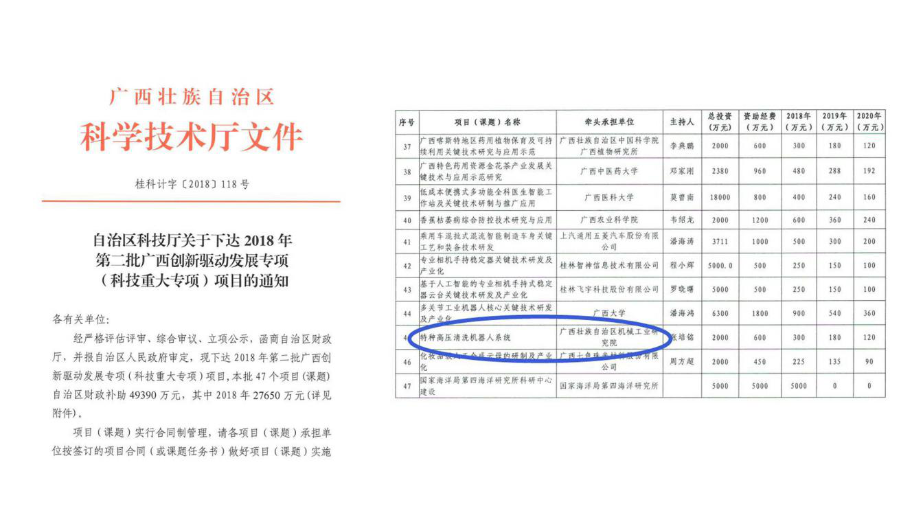 近日,廣西科技廳下達了桂科計字[2018]118號文關于《2018年第二批廣西創新驅動發展專項(科技重大專項)項目的通知》,我院的特種高壓清洗機器人系統獲自治區財政補助600萬元。